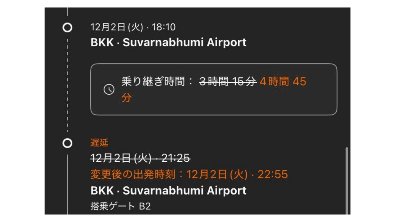 国内線は飛行機の遅れで、搭乗便が変更になりました。