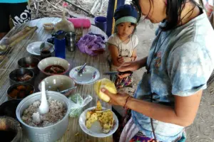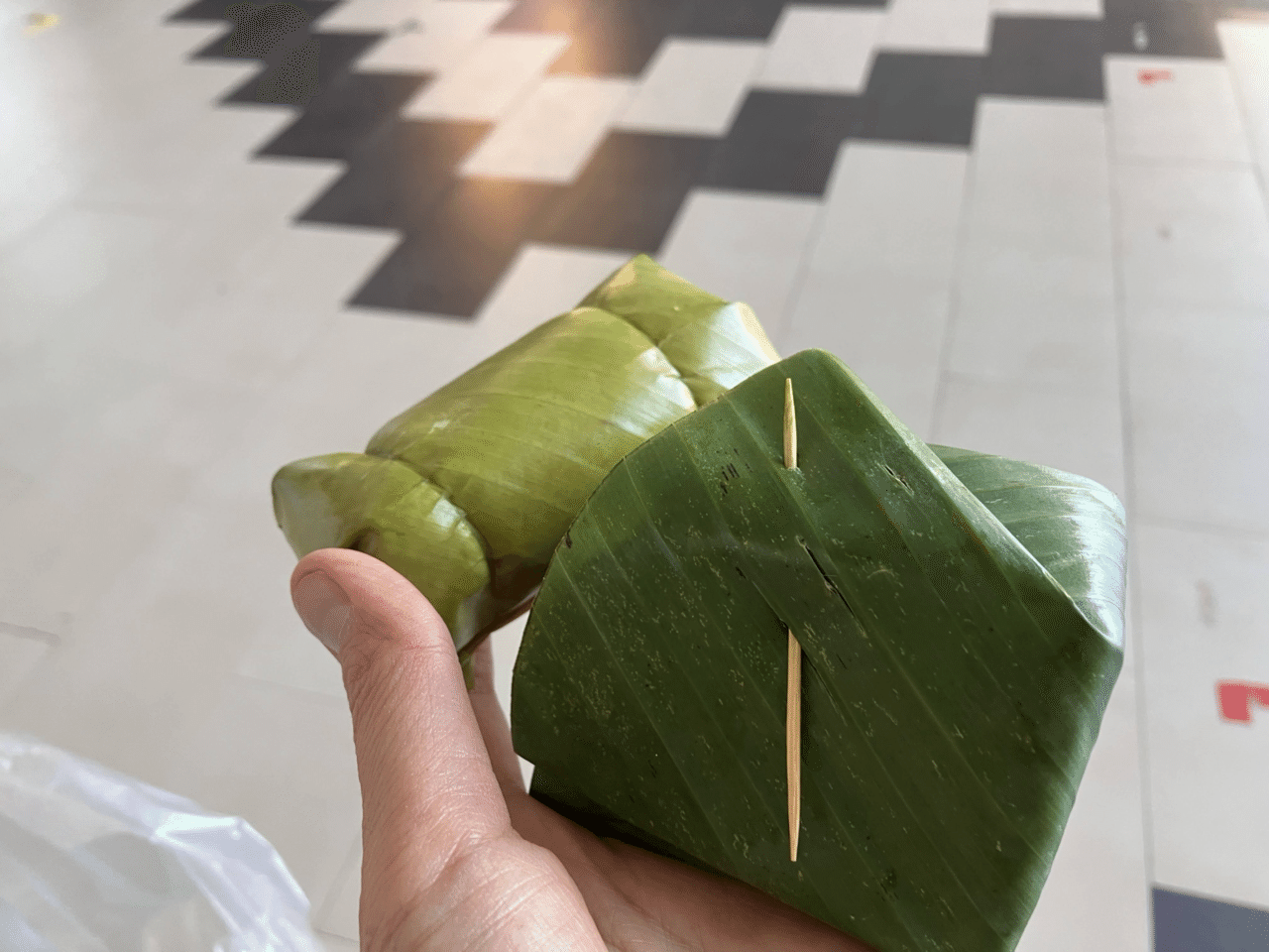 ココナッツミルクで炊いた餅米にバナナを入れて蒸してあるおやつです。