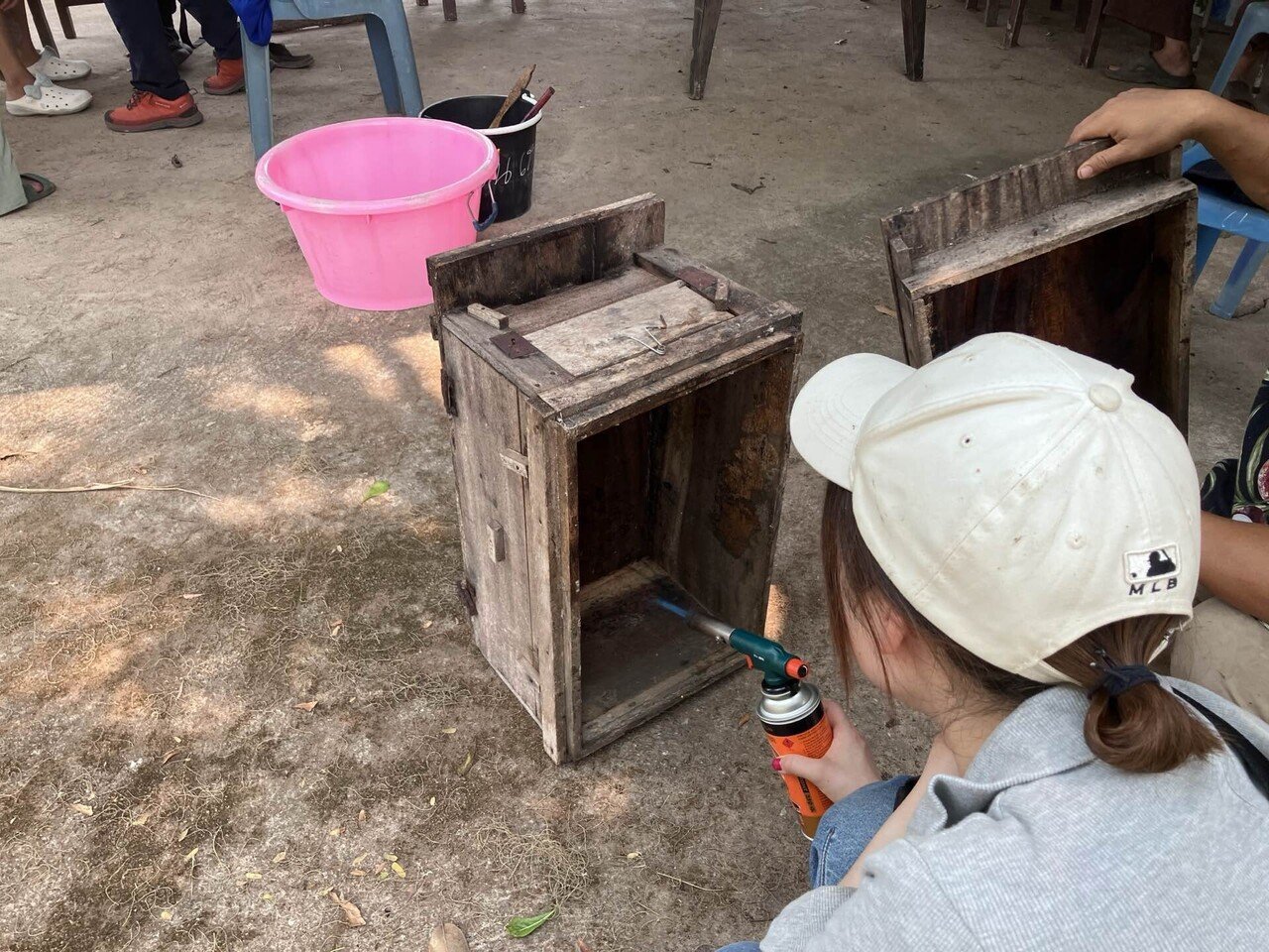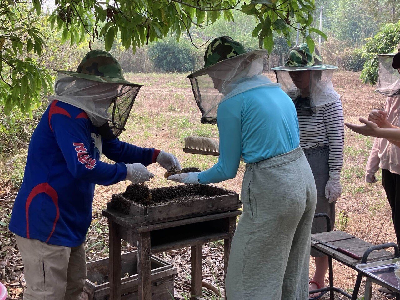蜂飼いさんが一つずつ箱をあげて、