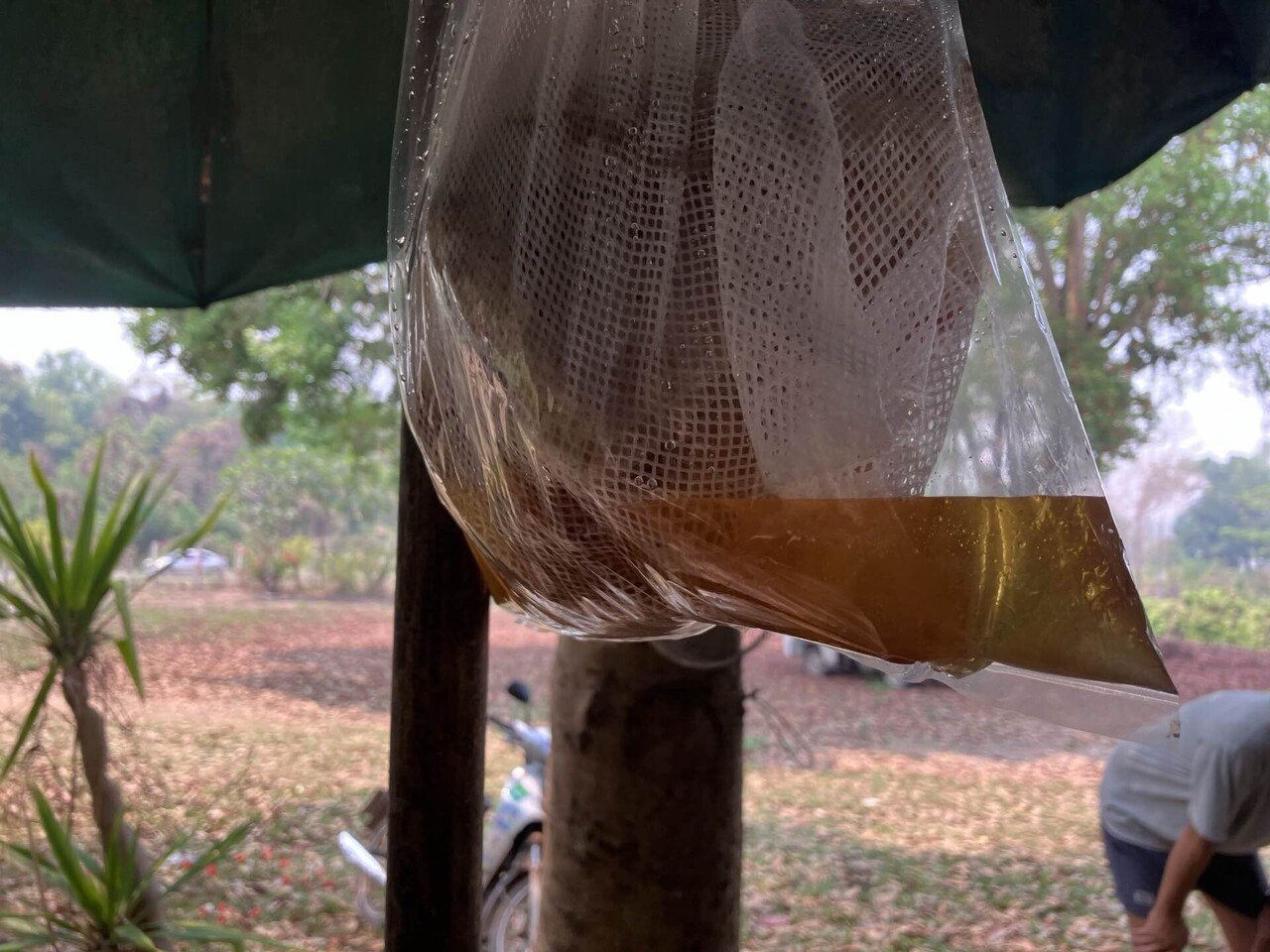 機械を使わないので、この状態で吊るして蜜が落ちるのをまちます。