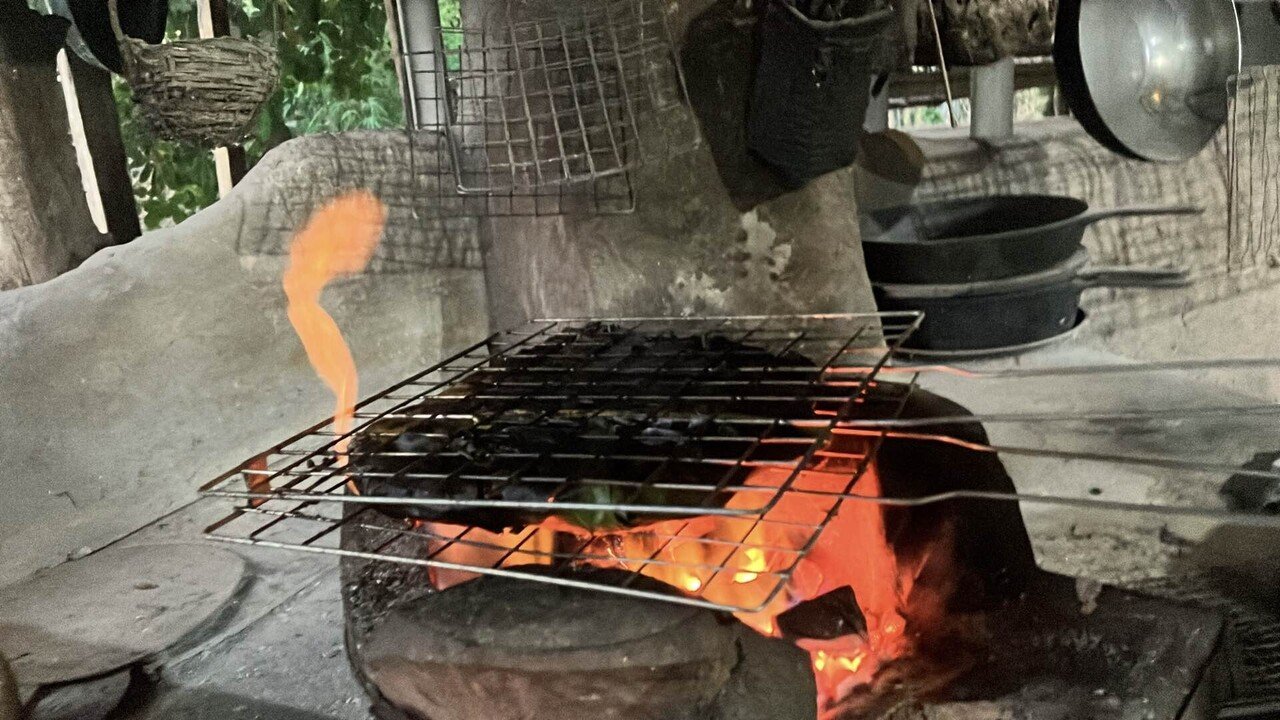 蜂の巣は塩を振って、バナナの葉で包んで丸焼きです。