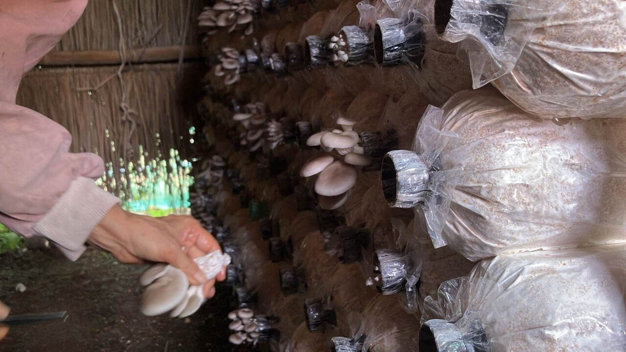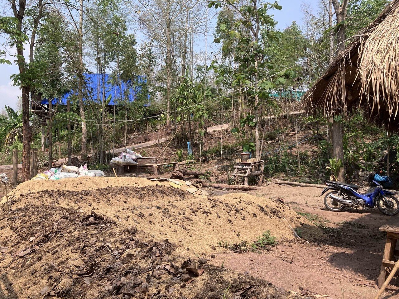牛のうんち、枯れ葉、籾殻くん炭を混ぜて水をやって発酵させます。