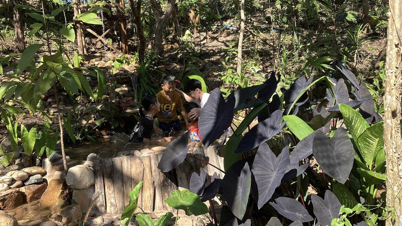 この水は少しずつ下に流し、犬が水を飲んだり、子どもたちが水遊びをしたり