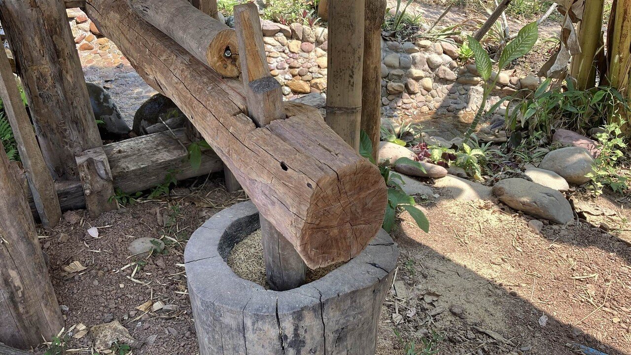 石積みをしてできたタンクから水を流すと機械が動く仕組みです。