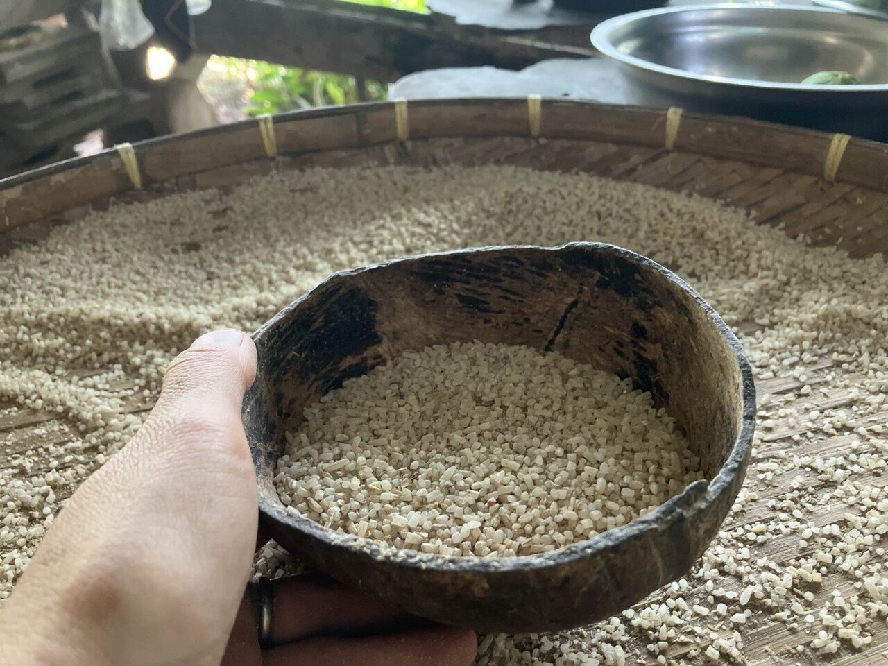 それから乾燥させて、皮を剥ぎ、砕き、24時間ペーストにし続ける。