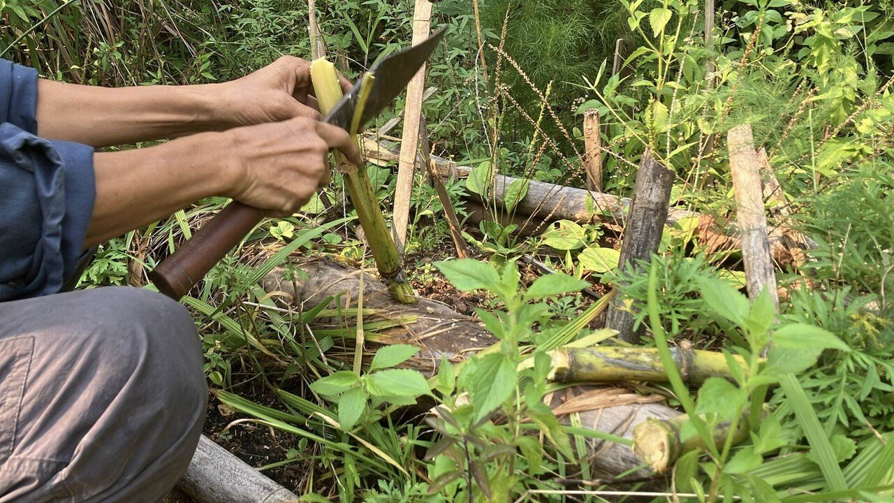 サトウキビをうまくナタで剥げなくて、お友達にカットしてもらいました。