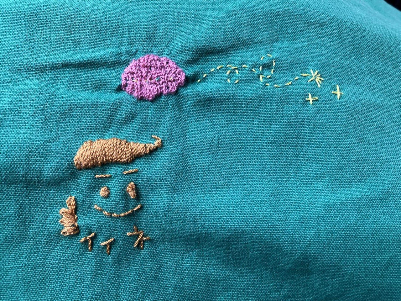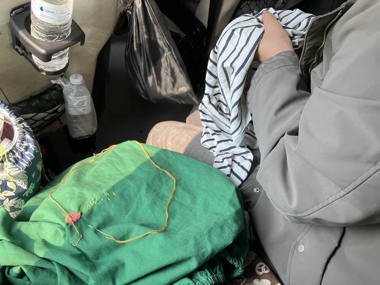 ゲストさん見送るバスの中で、ゲストさんのお一人とお裁縫タイム。