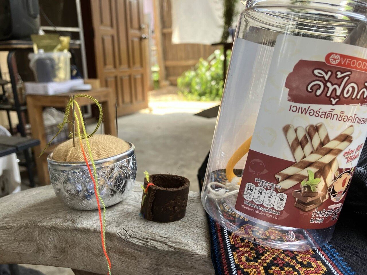 ハサミと針山、お友達ににもらった革細工の端っこで作った